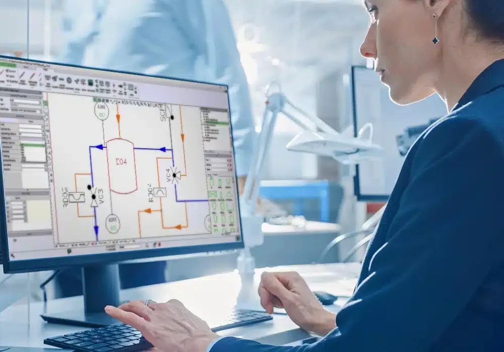 A woman working on an engineering schematic on a computer in a laboratory setting.
